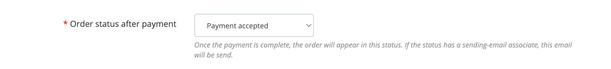 Once the customer paid the order, the module will set the Order Status. Here you can select the one you prefer. By default, the module will set it as a “Payment Accepted”.